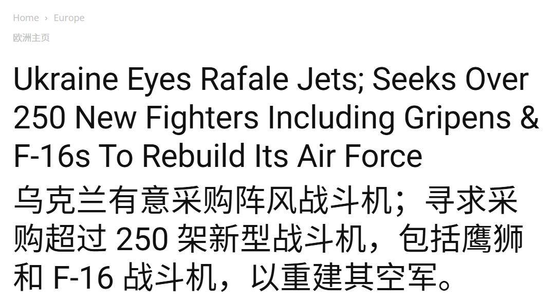 乌克兰要追求250架西方战机?(印媒《欧亚时报》报道截图)