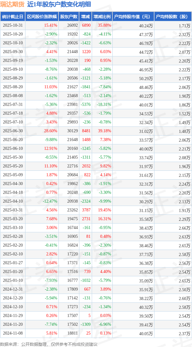 从股价来看,2025年10月20日至2025年10月31日,瑞达期货区间涨幅为15.41%,在此期间股东户数增加6890.0户,增幅为35.88%。