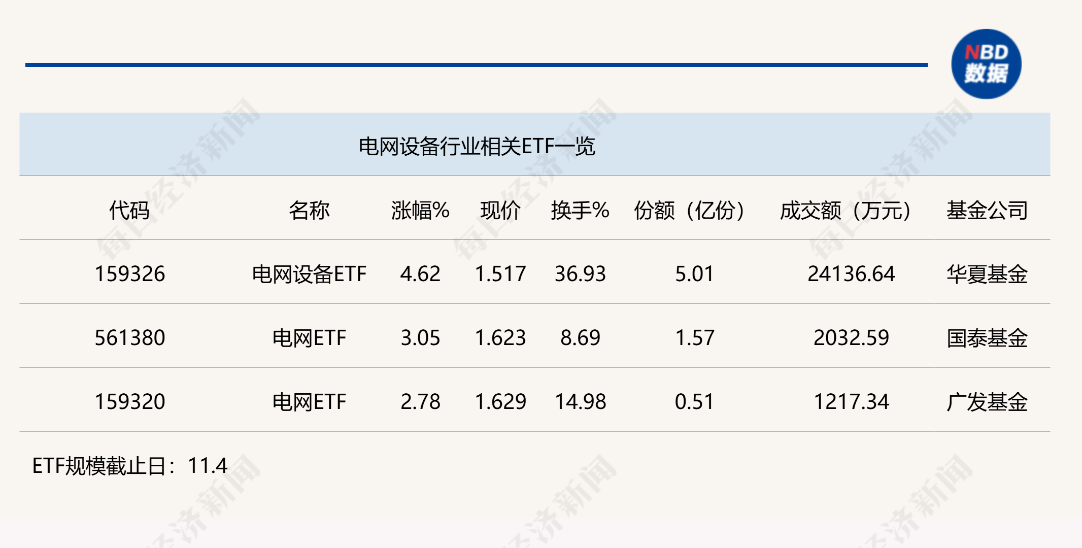 点评:电网设备ETF(159326)今日上午涨幅达到4.62%,其份额为5.01亿份,半日成交金额达到2.41亿元,其追踪的是中证电网设备主题指数。