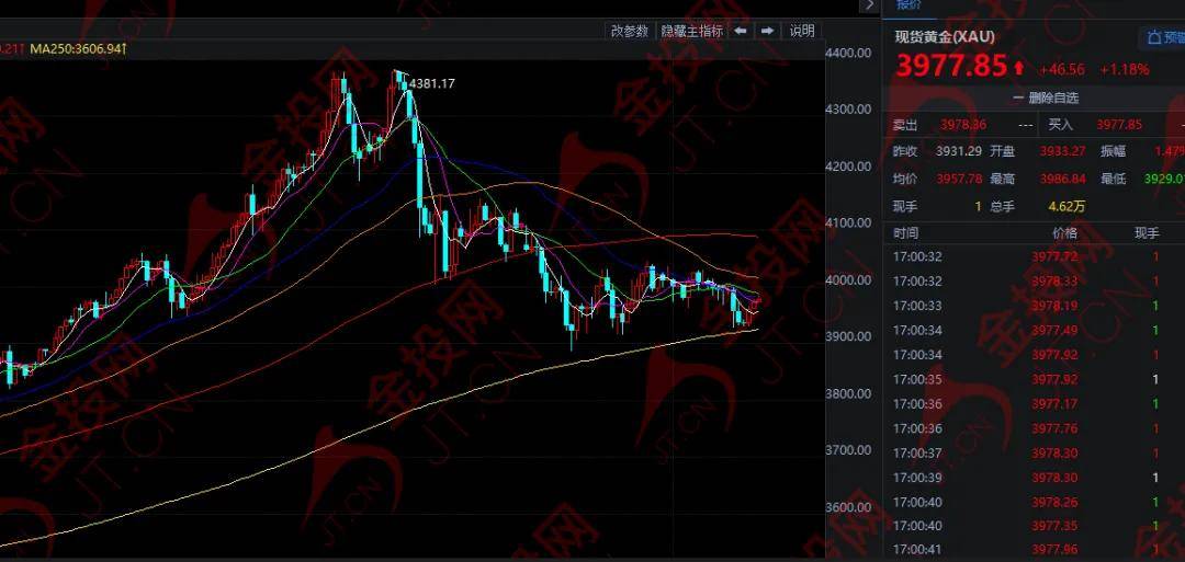 隔夜,现货黄金收盘暴跌69.52美元,跌幅1.74%,最终收报于3931.86美元。今日欧市盘中,黄金小幅上涨,目前在3971美元附近徘徊。