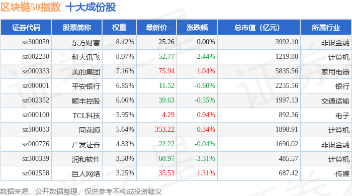 证券之星消息,11月5日,区块链50(399286)指数报收于4094.27点,跌0.65%,成交457.02亿元,换手率2.12%。当日该指数成份股中,上涨的有9家,巨人网络以1.31%的涨幅领涨,下跌的有40家,科大国创以7.42%的跌幅领跌。