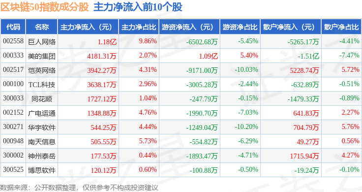 资金流向方面,区块链50(399286)指数成份股当日主力资金净流出合计26.61亿元,游资资金净流出合计1.43亿元,散户资金净流入合计28.04亿元。成份股资金流向详情见下表: