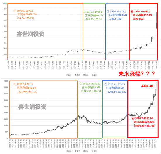 其三,展望未来5至10年,现有国际秩序的动荡局面预计将持续演进,“百年变局”向纵深发展,这将成为推动金价上行的核心动力。若参照1970年代的走势模式,则金价可能上涨至8000美元以上。