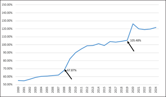 2008年全球爆发金融危机,全球同步采取财政货币扩张政策救市,全球经济逐步恢复后,主要国家债务负担率却没有下降。自2008年起,美国债务负担率从50%跃升至100%的水平后始终未能回落。除了2008年的全球金融危机以外,2008年另一个关键转折点是欧美人口结构的变化。数据显示,2000年以后欧洲抚养比出现结构性转折,至2008年前后老年抚养比例持续攀升,财政压力显著加大,美国的情况也与之相似。从2008年至今,欧美国家普遍面临老龄化加剧、产业空心化的情况,叠加新冠疫情的冲击,一步步强化了上述趋势。2020年全球疫情期间美国采取紧急刺激措施,通过直接发放现金以维持消费,使债务负担率经历了第二轮攀升,终于达到120%的高位,当年美国债务率正式突破二战时期峰值,成为影响全球政治、金融与资本市场的重要转折点,其后续影响仍在持续显现。此外,一个值得关注的历史数据是,克林顿在任期最后一年曾实现两千多亿美元的财政盈余。而1999-2001年也是金价自1980年以后价格最低的时间段。