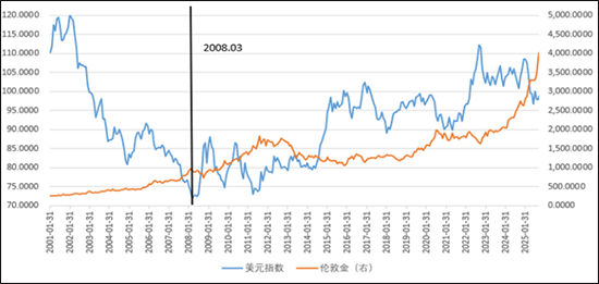 我们将时间尺度拉长,从2008年开始观察。黄金与美元之间长期存在反向关系,但2008年成为全球黄金定价机制的一个重要转折点。那一年3月,美元指数处于约70的历史低位,至今已上涨约40%至98;同期,黄金价格则从每盎司约1000美元上涨至目前的4300美元之上。