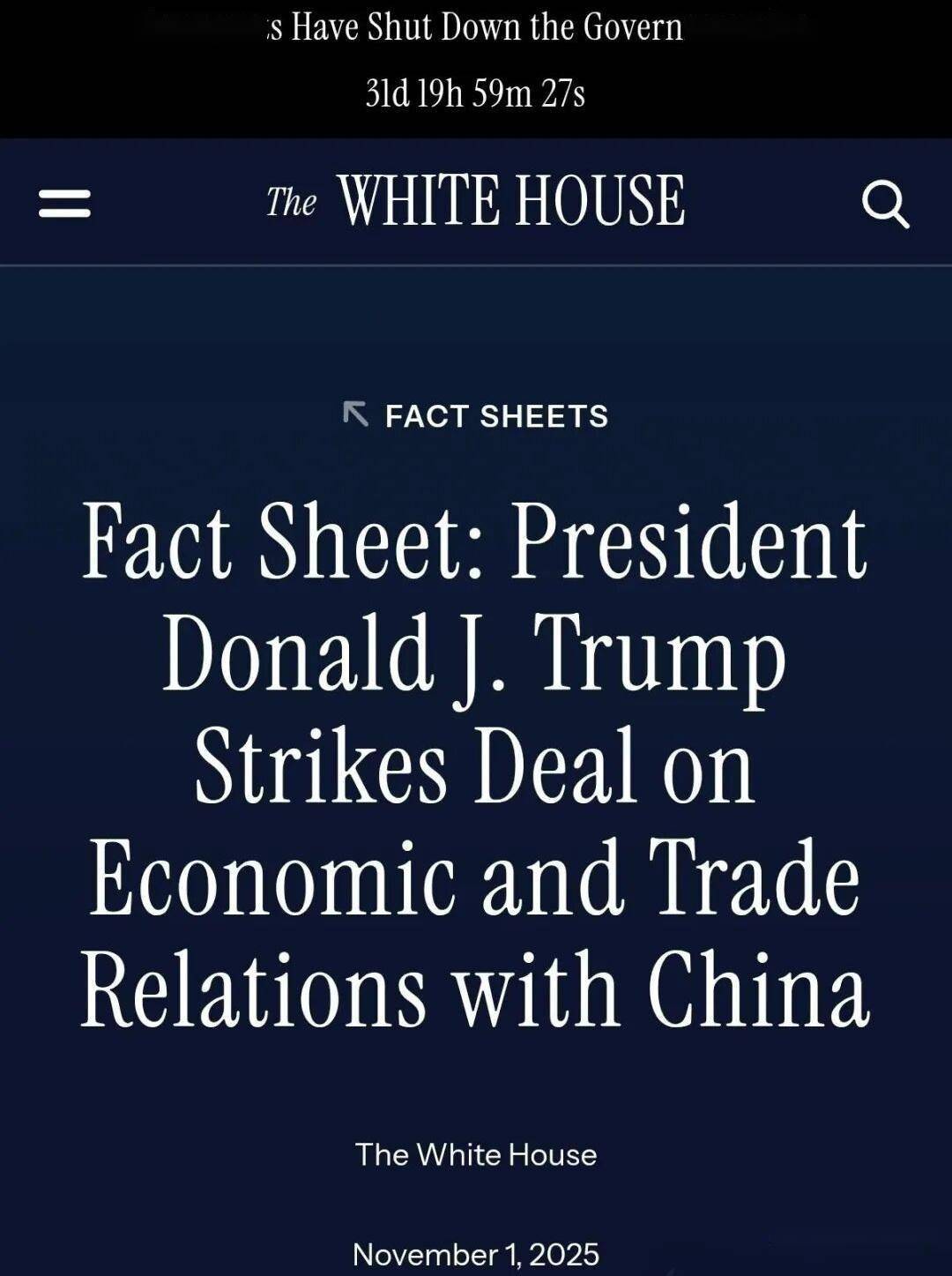 当地时间2025年11月1日,美国白宫发布文件, 宣布自2025年11月10日起下调部分对华关税。