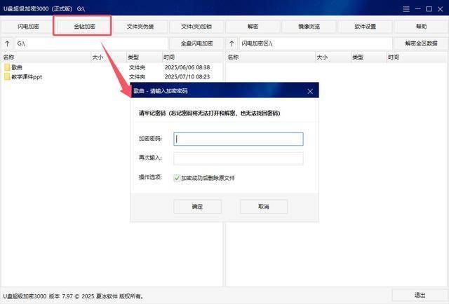 注意:金钻加密的密码一旦忘记,文件将无法解密,所以务必牢记密码!