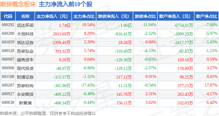 从资金流向上来看,当日期货概念板块主力资金净流出9.17亿元,游资资金净流入2.23亿元,散户资金净流入6.94亿元。期货概念板块个股资金流向见下表: