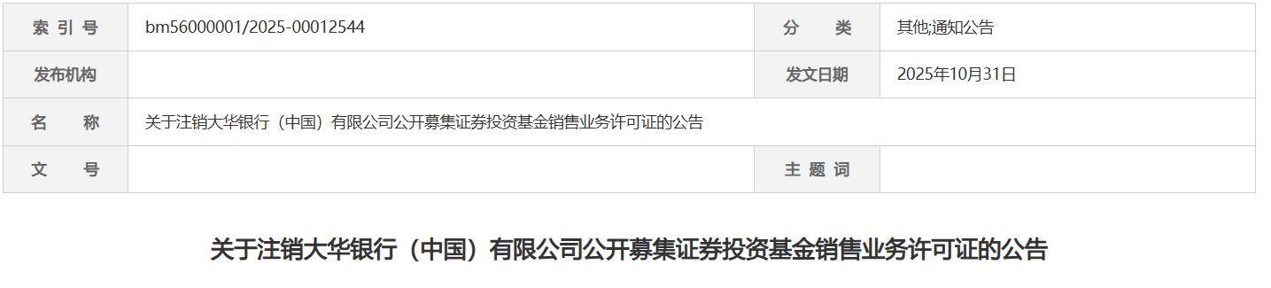 10月31日,上海证监局发布公告称,近期,大华银行(中国)有限公司(以下简称“大华银行”)向中国证券监督管理委员会提交了注销公开募集证券投资基金销售业务许可证的申请。根据《行政许可法》《证券投资基金法》《公开募集证券投资基金销售机构监督管理办法》等有关规定,中国证券监督管理委员会决定注销大华银行(中国)有限公司公开募集证券投资基金销售业务许可证。
