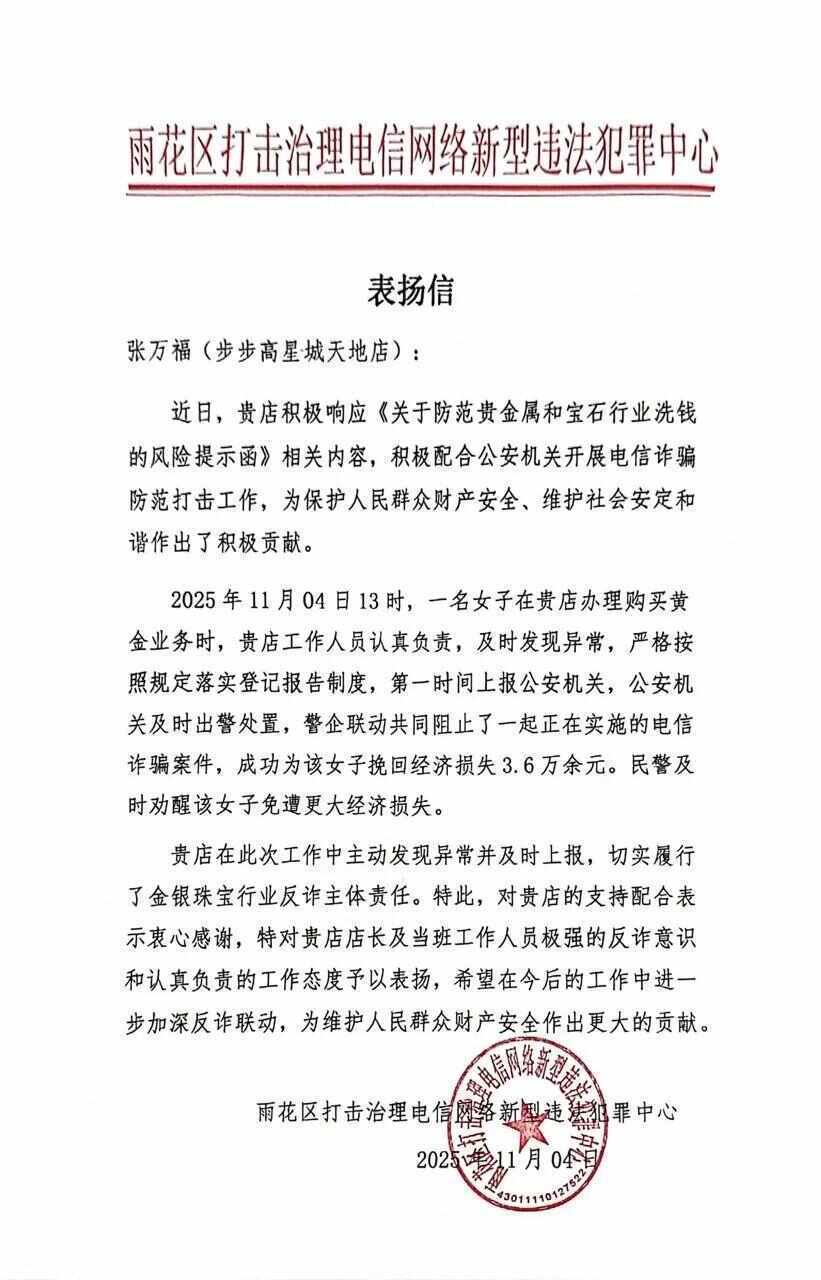11月5日下午,井湾子派出所为张万福珠宝店(步步高星城天地店)送来表扬信,对该金店工作人员在反诈工作中发挥的重大作用表示赞扬和感谢!