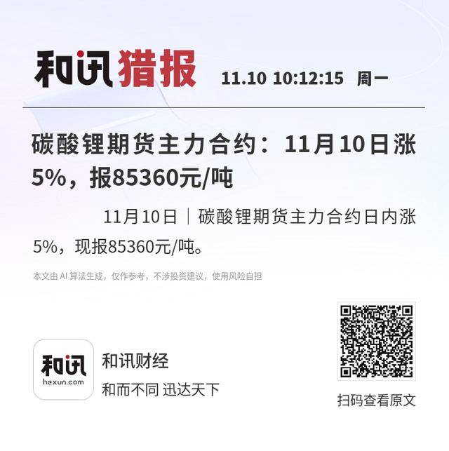 11月10日|碳酸锂期货主力合约日内涨5%,现报85360元/吨。