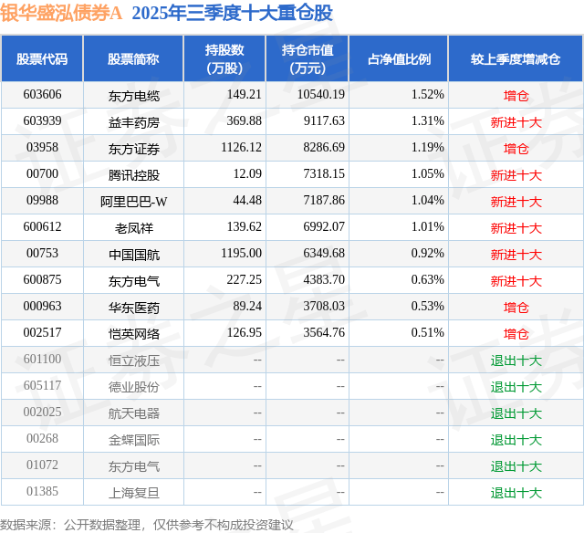 根据2025基金Q3季报公募基金重仓股数据,重仓该股的公募基金共5家,其中持有数量最多的公募基金为银华基金的银华盛泓债券A。银华盛泓债券A目前规模为36.78亿元,最新净值1.0966(11月7日),较上一交易日下跌0.12%,近一年上涨8.09%。该公募基金现任基金经理为阚磊 于蕾 李程。阚磊在任的基金产品包括:银华安盈短债债券A,管理时间为2023年8月11日至今,期间收益率为5.82%;银华安丰中短期政策性金融债债券A,管理时间为2023年8月11日至今,期间收益率为7.53%;银华岁丰定期开放债券发起式,管理时间为2023年9月22日至今,期间收益率为8.32%;银华致淳债券,管理时间为2023年12月21日至今,期间收益率为6.65%。于蕾在任的基金产品包括:银华钰祥债券A,管理时间为2025年8月21日至今,期间收益率为1.96%。李程在任的基金产品包括:银华汇盈一年持有期混合A,管理时间为2025年4月3日至今,期间收益率为4.33%;银华招利一年持有期混合A,管理时间为2025年4月3日至今,期间收益率为9.86%;银华钰祥债券A,管理时间为2025年8月22日至今,期间收益率为1.8%。