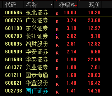 券商等金融股拉升,东北证券涨停。