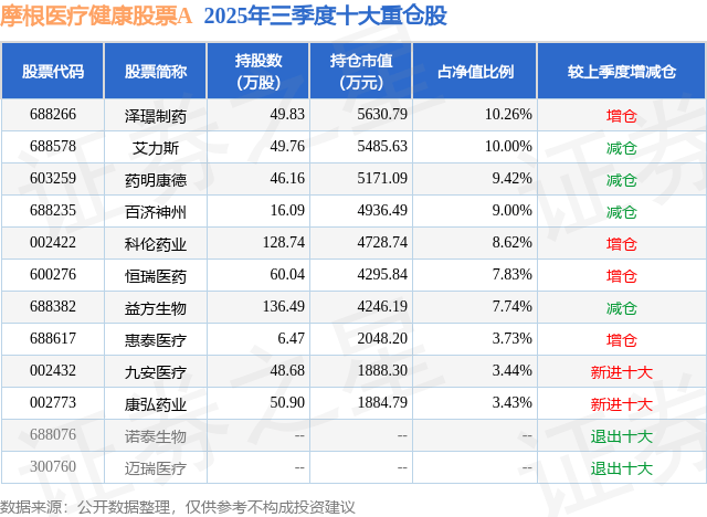 根据2025基金Q3季报公募基金重仓股数据,重仓该股的公募基金共6家,其中持有数量最多的公募基金为摩根基金(中国)的摩根医疗健康股票A。摩根医疗健康股票A目前规模为5.45亿元,最新净值1.5047(11月7日),较上一交易日下跌1.47%,近一年上涨16.29%。该公募基金现任基金经理为叶敏。叶敏在任的基金产品包括:摩根成长动力混合A,管理时间为2022年7月27日至今,期间收益率为-4.81%;摩根中国生物医药混合(QDII)A,管理时间为2024年3月29日至今,期间收益率为42.41%;摩根创新商业模式混合A,管理时间为2025年5月29日至今,期间收益率为26.68%。