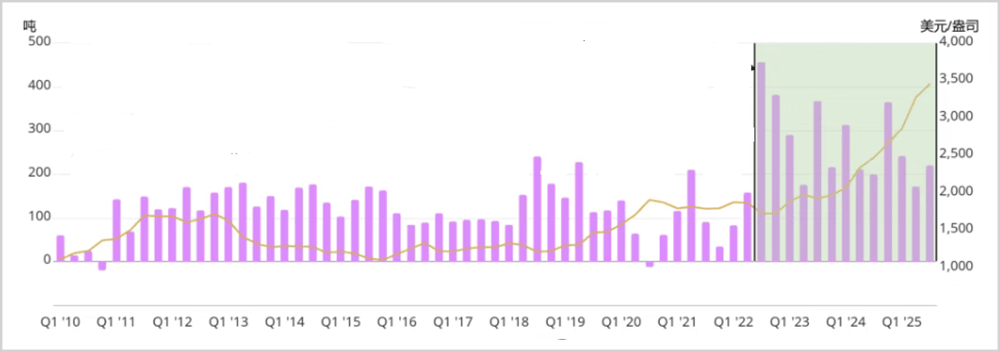 过去一年中,伦敦黄金库存同比暴跌22%,日均交易量却激增18%。与此同时,全球央行持续购金,这些黄金一旦被购入就不会回流市场,相当于不断从金融系统中抽走流动性。