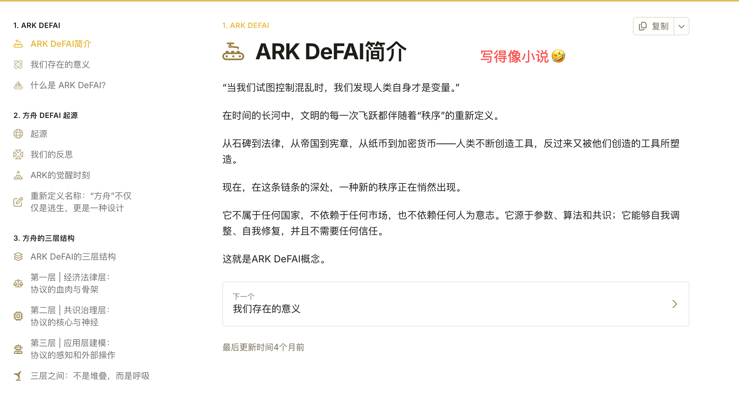 看看ARK这gitbook,笔者刚点进来的时候以为点进了小说网站,这章节和内容写的像玄幻小说。ARK项目应该改个名字,不应该蹭华尔街木头姐的ARK投资公司,应该改名为“修仙传”。