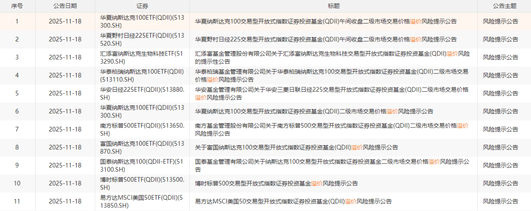 随着跨境ETF交易活跃度的显著提升,近期机构密集提示跨境ETF的高溢价风险。据不完全统计,截至11月18日,11月以来相关公告数量多达300余条。