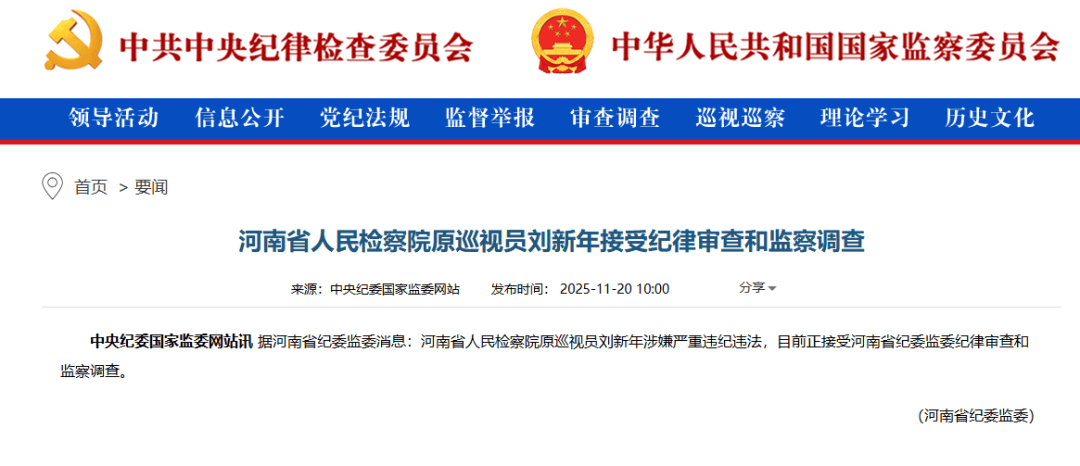据河南省纪委监委消息:河南省人民检察院原巡视员刘新年涉嫌严重违纪违法,目前正接受河南省纪委监委纪律审查和监察调查。