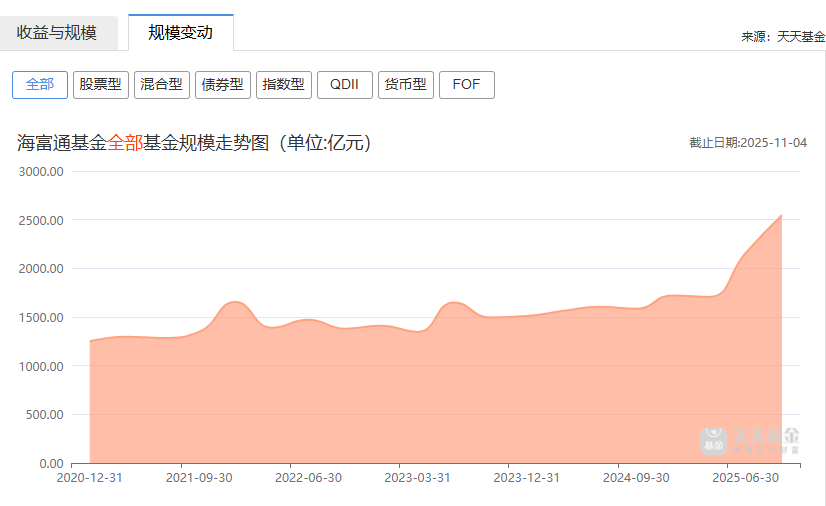从2025年3月31日到11月4日,短短七个多月,他就把海富通的管理规模从1706.17亿元拉到了2545.47亿元,涨了839.30亿元,涨幅高达49.19%。