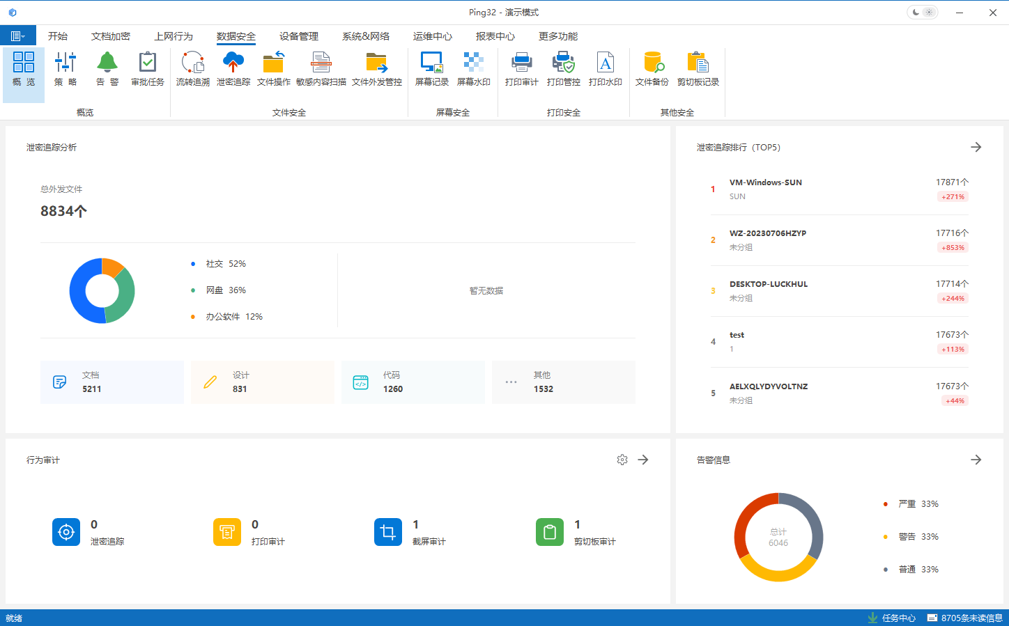 Ping32的运维中心是管理员的“智慧大脑”,提供集中化、可视化的管理界面。通过运维中心,管理员可实时查看全公司文件的加密状态、权限分配、操作日志等关键信息,无需逐台设备检查。例如,若某部门频繁出现异常文件访问行为,系统会自动标记并在运维中心生成告警,管理员可一键定位问题设备或用户。