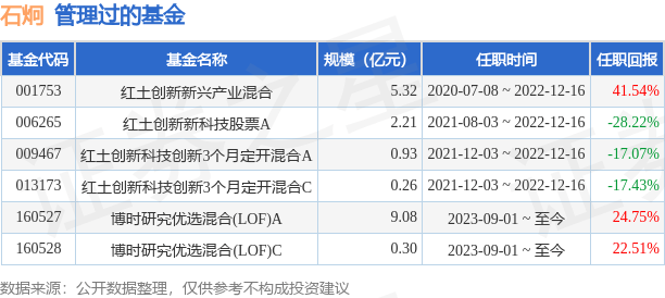 石炯先生:中国国籍,暨南大学金融学硕士,曾任中国中投证券机械行业研究员,东吴证券机械军工行业研究员,红土创新基金智能制造行业研究员,曾任红土创新新兴产业混合基金基金经理。2021年8月3日至2022年12月16日担任红土创新新科技股票型发起式证券投资基金基金经理。曾任红土创新科技创新3个月定期开放混合型证券投资基金基金经理。2023年9月1日起担任博时研究优选灵活配置混合型证券投资基金(LOF)基金经理。