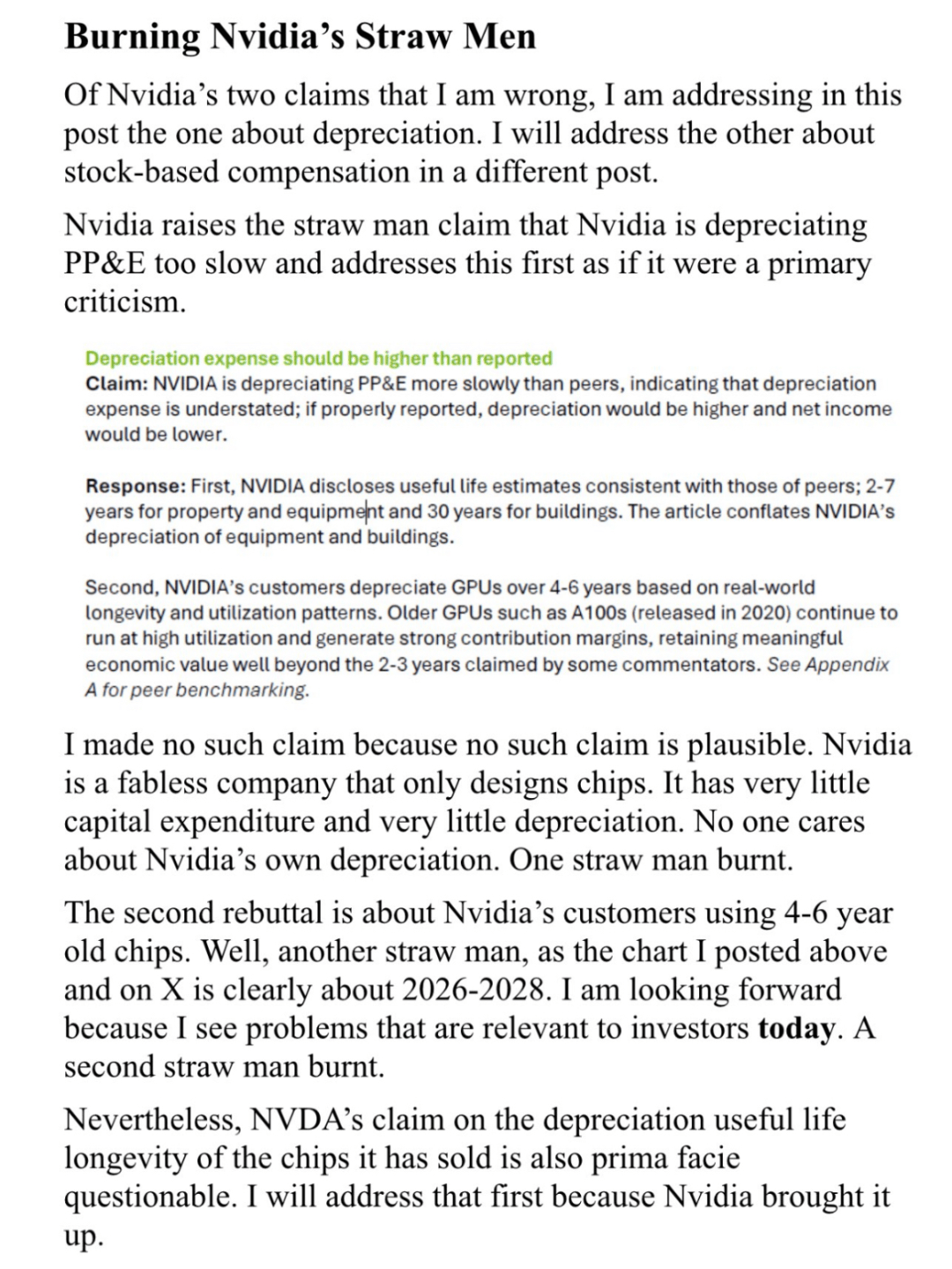 在这篇文章中,巴里表示,首先,英伟达在回应中声称其自身的厂房设备折旧政策并无不当。然而,巴里强调,他从未提出过此类指控,并解释称,作为一家芯片设计公司,英伟达自身的资本支出和折旧额极小,根本非其批评的焦点。他认为英伟达此举是避重就轻。