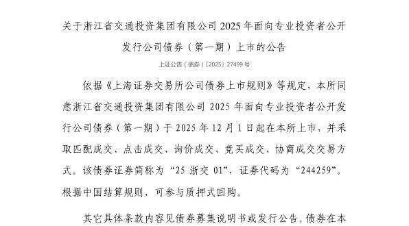 依据《上海证券交易所公司债券上市规则》等规定,上交所同意浙江省交通投资集团有限公司2025年面向专业投资者公开发行公司债券(第一期)于2025年12月1日起在上交所上市,并采取匹配成交、点击成交、询价成交、竞买成交、协商成交交易方式。该债券证券简称为“25浙交01”,证券代码为“244259”。根据中国结算规则,可参与质押式回购。