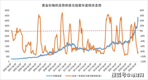 黄金价格与美元指数的年度走势呈现显著负相关性,这一关联是金价波动的核心逻辑之一。国际黄金以美元计价,美元指数强弱直接影响全球购金成本:当美元指数走强时,非美元持有者购金成本上升,需求被抑制,金价往往同步走弱;而美元指数走弱时,黄金的“性价比”提升,全球资金涌入推升黄金价格。