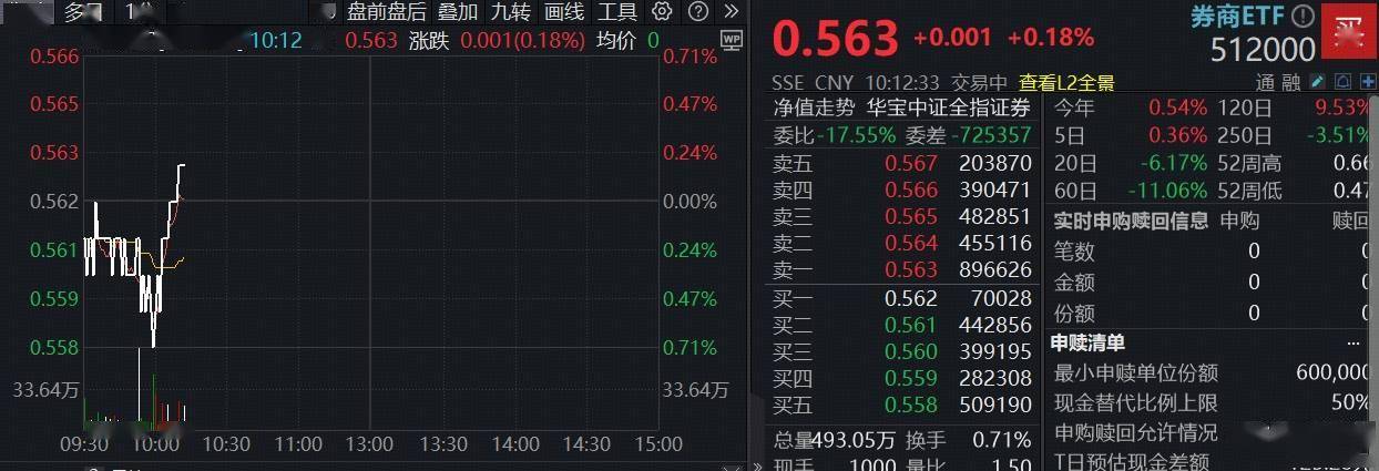 11月28日,券商板块走势活跃,389亿顶流券商ETF(512000)自水下拉升翻红,场内价格现涨0.18%。个股多数飘红,湘财股份、兴业证券涨超1%。