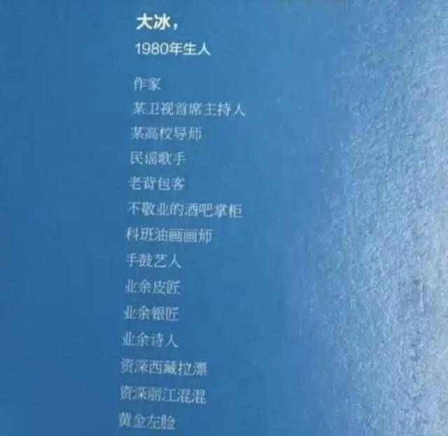 还有网友翻出大冰给自己贴的“作家/某卫视首席主持人/某高校导师/民谣歌手/老背包客/不敬业的酒吧掌柜/科班油画画师/手鼓艺人/业余皮匠/业余银匠/业余诗人/资深西藏拉漂/资深丽江混混/黄金左脸”等长达十几个前缀的身份标签,质疑其身份营销复杂。