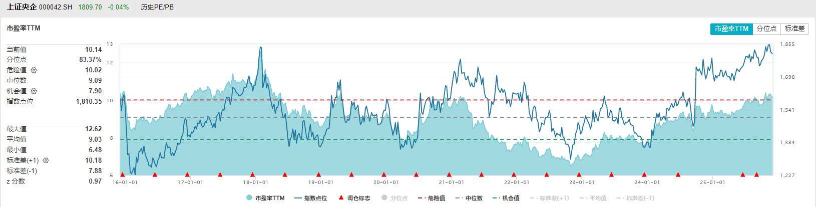 再看两个指数目前的估值水平,Wind数据显示,中证央企结构调整指数目前的市盈率TTM处在近十年60%左右分位,属于中等偏上的位置,而上证央企50指数目前的市盈率TTM处在近十年80%以上分位,属于较高位置。