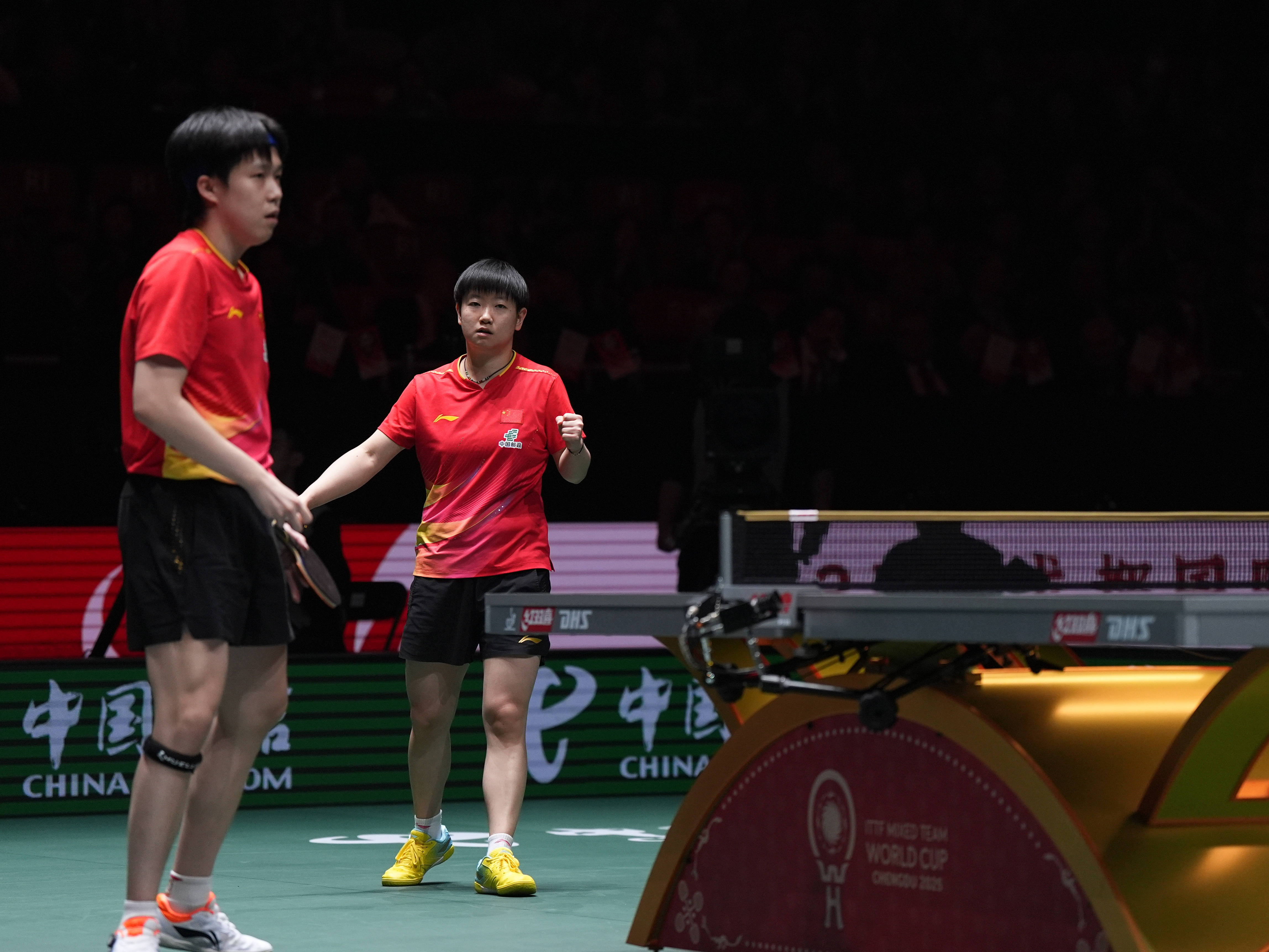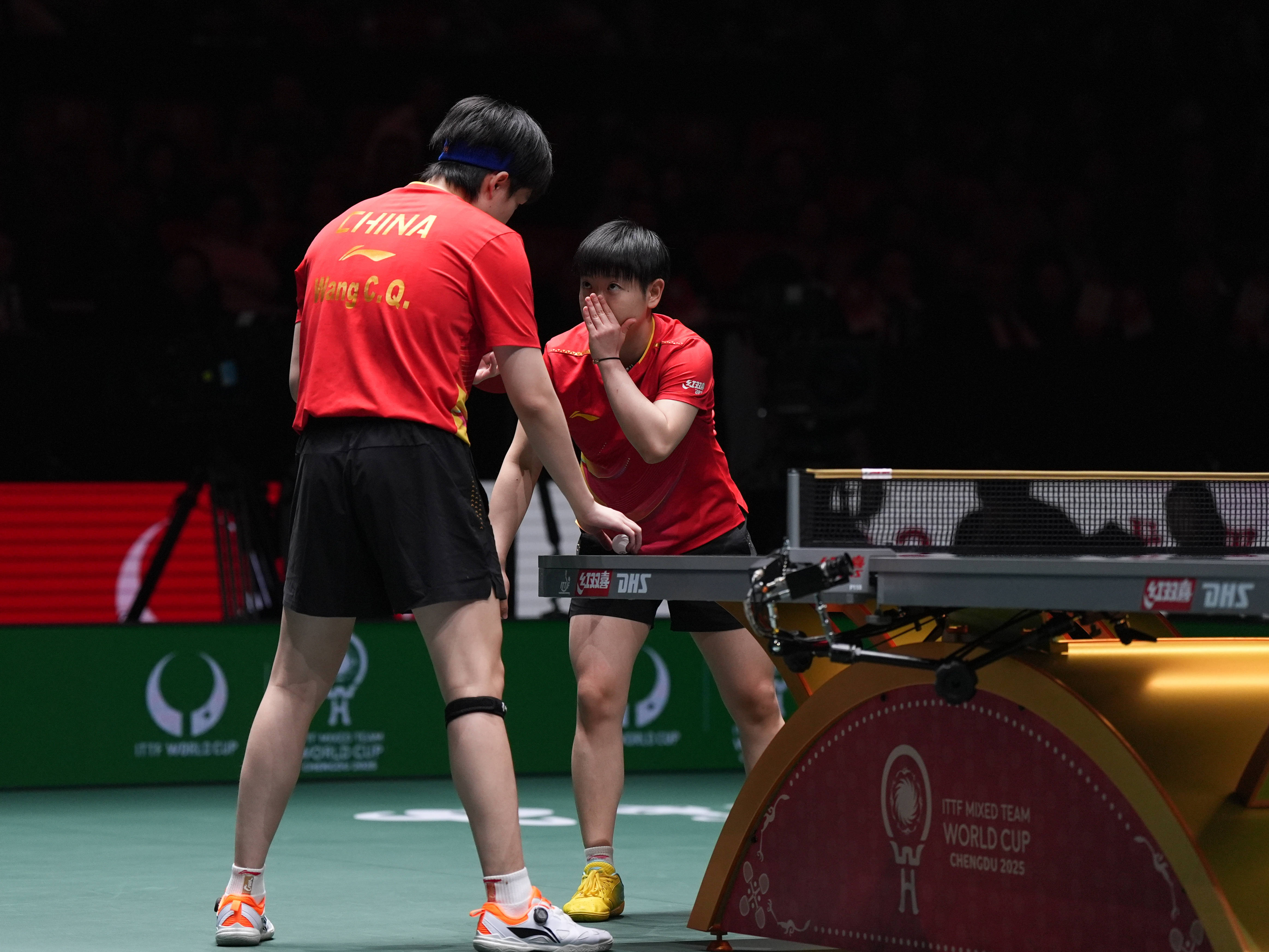 当日,在四川成都举行的2025年国际乒联混合团体世界杯决赛中,中国队对阵日本队。