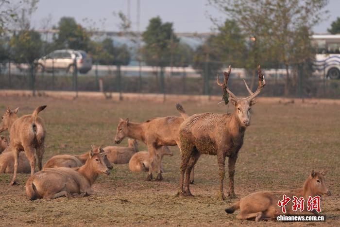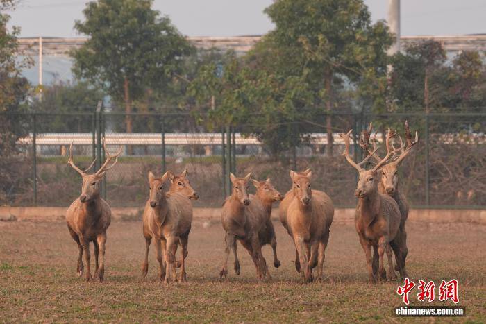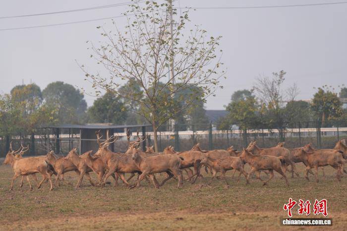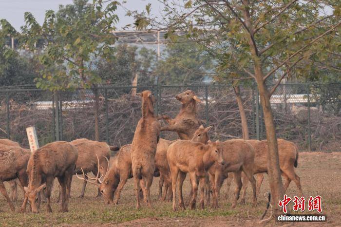 12月9日,“江湖四宝·湘北画卷”媒体生态探秘采风行活动的嘉宾来到湖南岳阳洞庭湖麋鹿苑,这里生活着一群自然野化麋鹿。为保护麋鹿,2016年东洞庭湖麋鹿与鸟类救助避难中心在此成立,近十年累计救助麋鹿80多头。图为被救助麋鹿在苑内嬉戏。中新社记者 杨华峰 摄