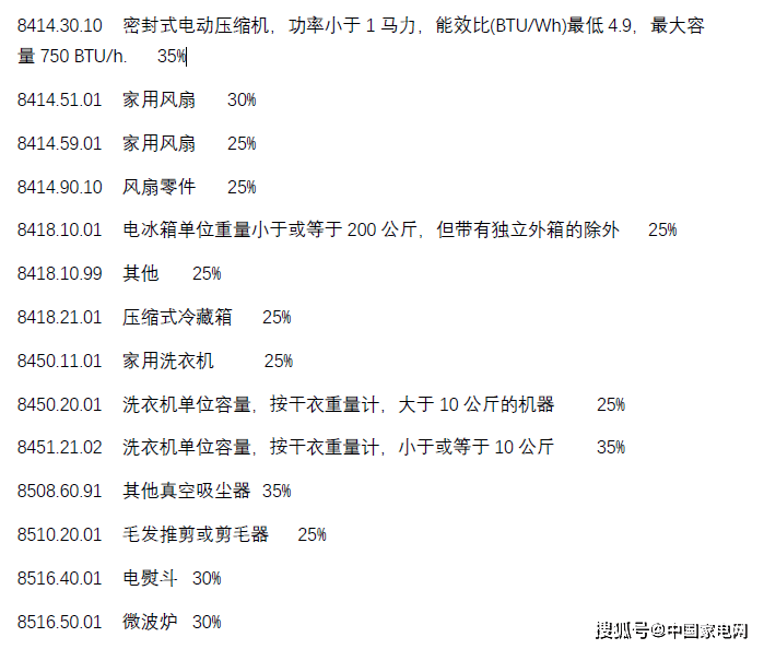 该关税法案对1463个产品分类进行了关税调整,调整后的税率在5%-50%,覆盖了化妆品、铁制品、家电、汽车等类目。其中家电产品包括: