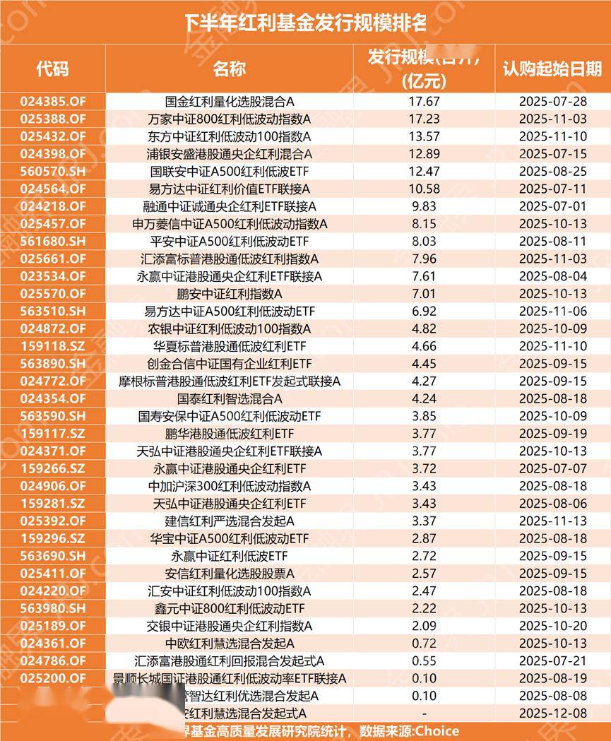 具体到单只产品,国金红利量化选股混合A以17.67亿元的募集规模,成为下半年最“吸金”的红利基金。紧随其后的万家中证800红利低波动指数A,募集规模也达到17.23亿元。此外,东方中证红利低波100指数A、浦银安盛港股通央企红利混合A等多只基金,募集规模均突破10亿元大关。