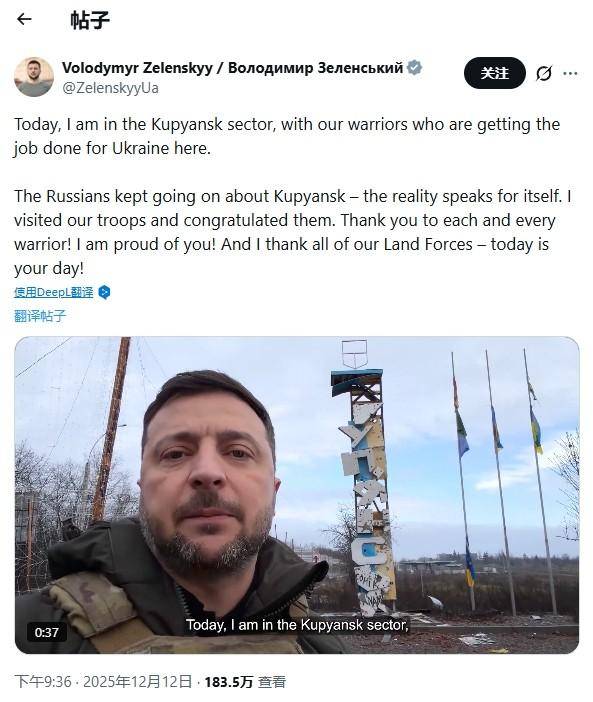 泽连斯基在社交媒体上声称,他在12月12日这天来到了库皮扬斯克,与乌军战士在一起。“尽管最近俄罗斯人谈论着占领库皮扬斯克,但事实胜于雄辩”。