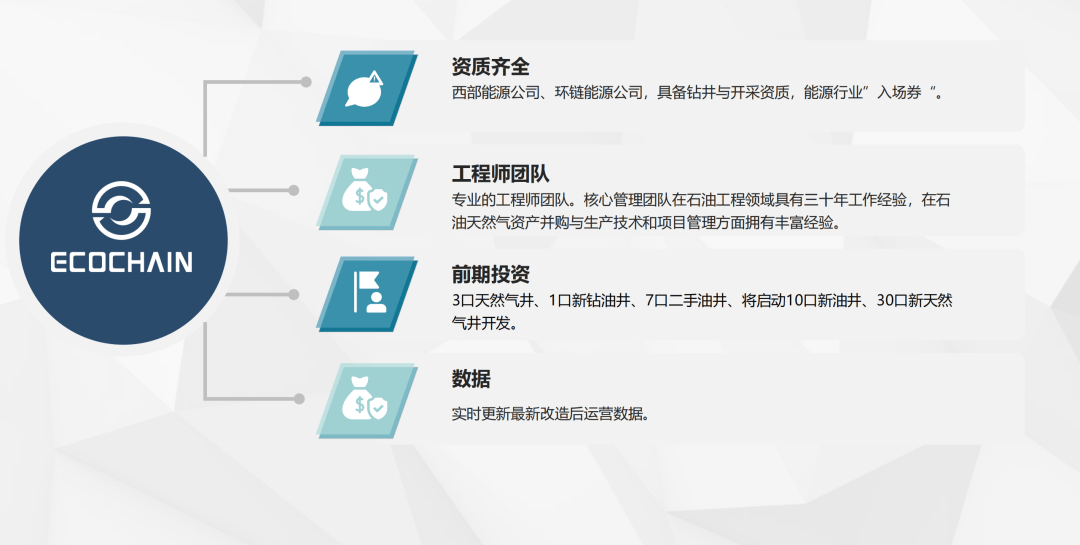 油气井资产将由ECOCHAIN ENERGY 81801 LTD(ECE1)提供及运营。RWOA运用多重验证技术实现现实资产在区块链上被认可和交易。本协议将提供资产上链、链上交易、借贷、审计、安全、存储、合约、跨链等应用场景,RWOA运行使用POW、POS、IPFS三重协议并行,保证网络运行稳定,确保数据信息安全。