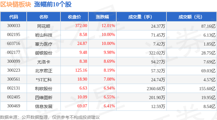证券之星消息,1月6日区块链板块较上一交易日上涨2.36%,同花顺领涨。当日上证指数报收于4083.67,上涨1.5%。深证成指报收于14022.55,上涨1.4%。区块链板块个股涨跌见下表: