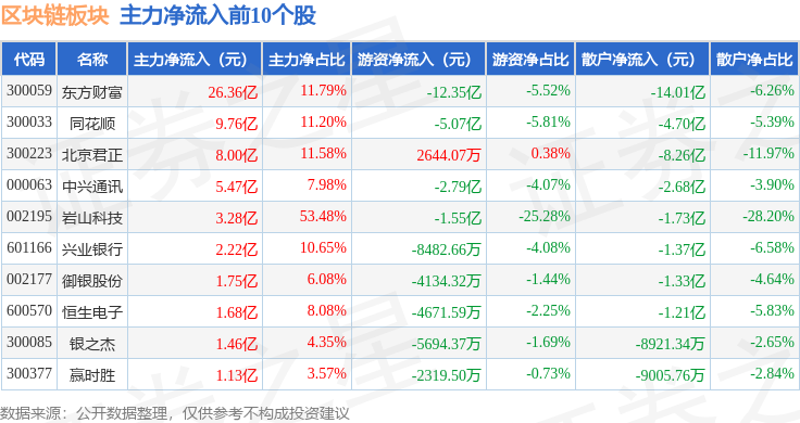 从资金流向上来看,当日区块链板块主力资金净流出4.61亿元,游资资金净流出24.58亿元,散户资金净流入29.18亿元。区块链板块个股资金流向见下表: