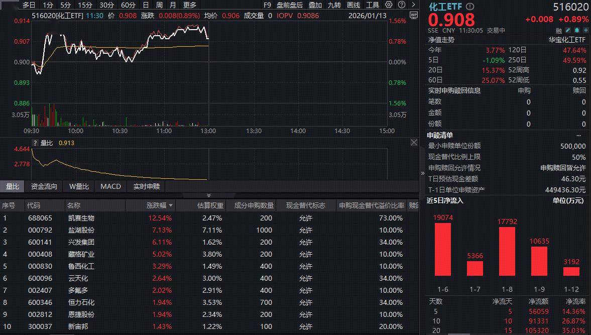 今日(1月13日),化工板块重拾攻势!反映化工板块整体走势的化工ETF(516020)开盘后迅速拉升,盘中场内价格最高涨幅达到1.56%,而后持续红盘震荡,截至午间收盘,涨0.89%。