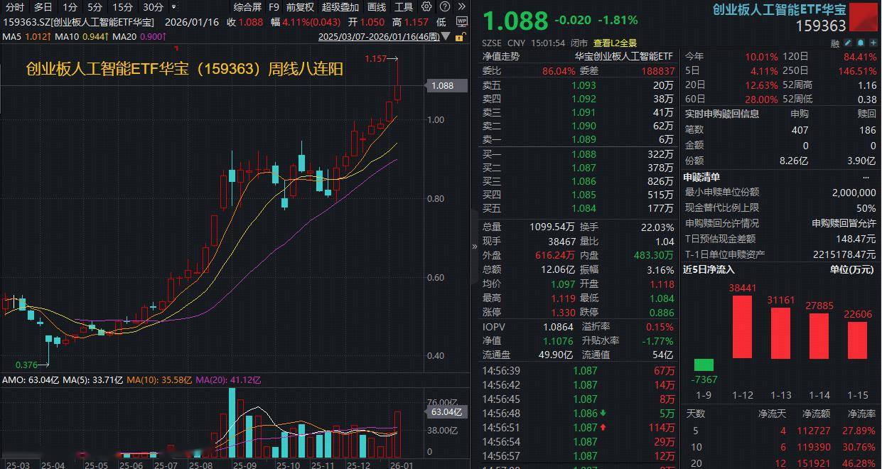 3、产品力显著优于同类标的!截至1月15日,创业板人工智能ETF华宝(159363)规模达55.27亿元创新高,近6个月日均成交额近8亿元,规模、成交额在跟踪创业板人工智能指数的8只ETF中高居第一!此外,港交所显示,159363正式纳入互联互通标的,1月19日正式生效,为北向资金配置优选,可进一步提升其场内交易活跃度。