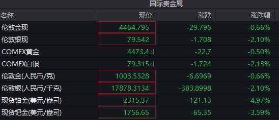 截至发稿,现货黄金跌0.66%报4464.795美元/盎司,现货白银跌2.1%报79.542美元/盎司,现货铂金跌4.97%报2315.37美元/盎司,现货钯金跌3.59%报1756.65美元/盎司。