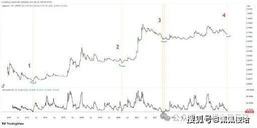 此外,周线RSI指标在32附近显示出一个反复出现的支撑区域,图表中以红色基线标示。从历史数据来看,每次RSI跌至或徘徊在基线1、2和3附近时,都标志着宏观底部的形成。