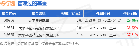 杨行远先生:中国国籍,中国科学院化学研究所理学博士,具有证券投资基金从业资格。2015年4月起先后担任东兴证券股份有限公司研究所研究员,中国人保资产管理有限公司公募基金事业部高级研究员、高级总监等职。2022年9月加入太平基金管理有限公司,现任研究部副总监。2023年4月19日至2025年4月7日担任太平灵活配置混合型发起式证券投资基金基金经理。