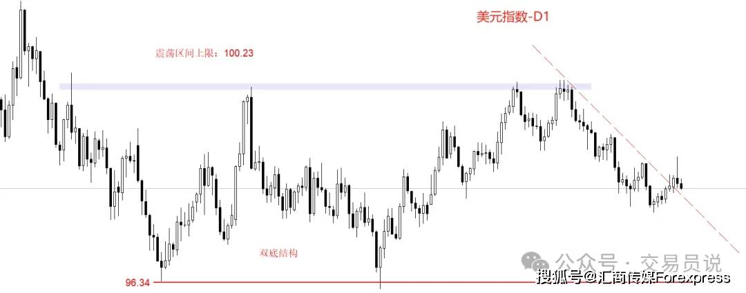 行情方面,美元指数依旧在下跌寻底。2025年7月1日,美元指数触及阶段性低点96.34点,该点位在随后数月的行情发展中被证明是重要的支撑位。过去半年的时间,美元指数通过两轮显著的反弹,确定了阶段性高点和强阻力位100.23点。目前美元指数稳定地运行在震荡区间(96.34~100.23)内部。2025年11月21日至今的下跌波段,受到图中下降趋势线(虚线)的限制,最终落点可能在震荡区间下限附近。上周四、五两日的阳K线上穿下降趋势线,行情存在调整下降趋势的可能。但昨日的长上影阴K线,打破了这种预期。如果今日K线继续收阴,跌势可能将延续。