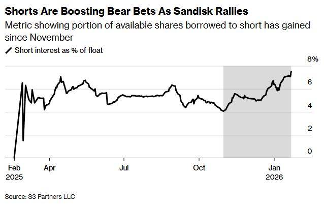 智通财经获悉,根据S3 Partners LLC的数据,随着存储芯片厂商Sandisk(SNDK.US)股价大幅上涨,该股的空头仓位在过去数月持续攀升,轧空风险已达到“极端”水平。