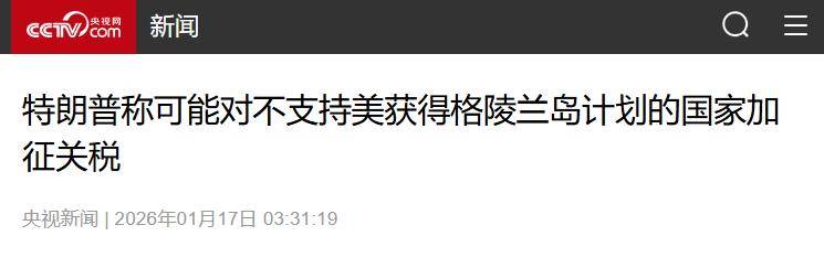 央视新闻 | 2026年01月17日特朗普称可能对不支持美获得格陵兰岛计划的国家加征关税