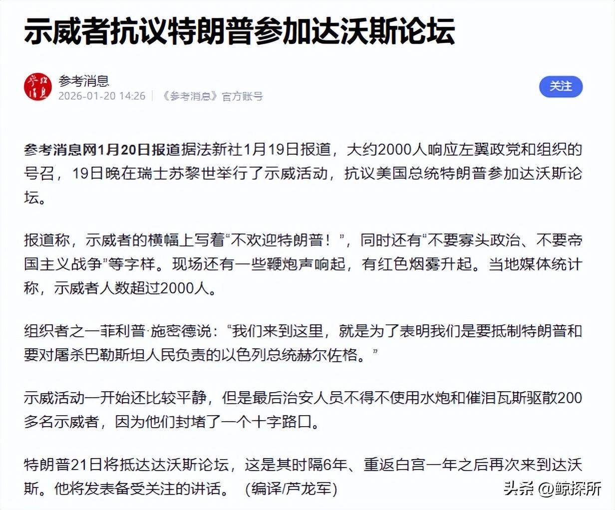报道称,警方强硬应对的原因是受到了石块和烟花的袭击,最终成功驱散了封堵十字路口的200多名激进示威者。幸运的是,冲突没有造成人员伤亡。然而,更引人关注的是,抗议活动并未局限于瑞士,格陵兰岛也爆发了史上最大规模的示威潮。