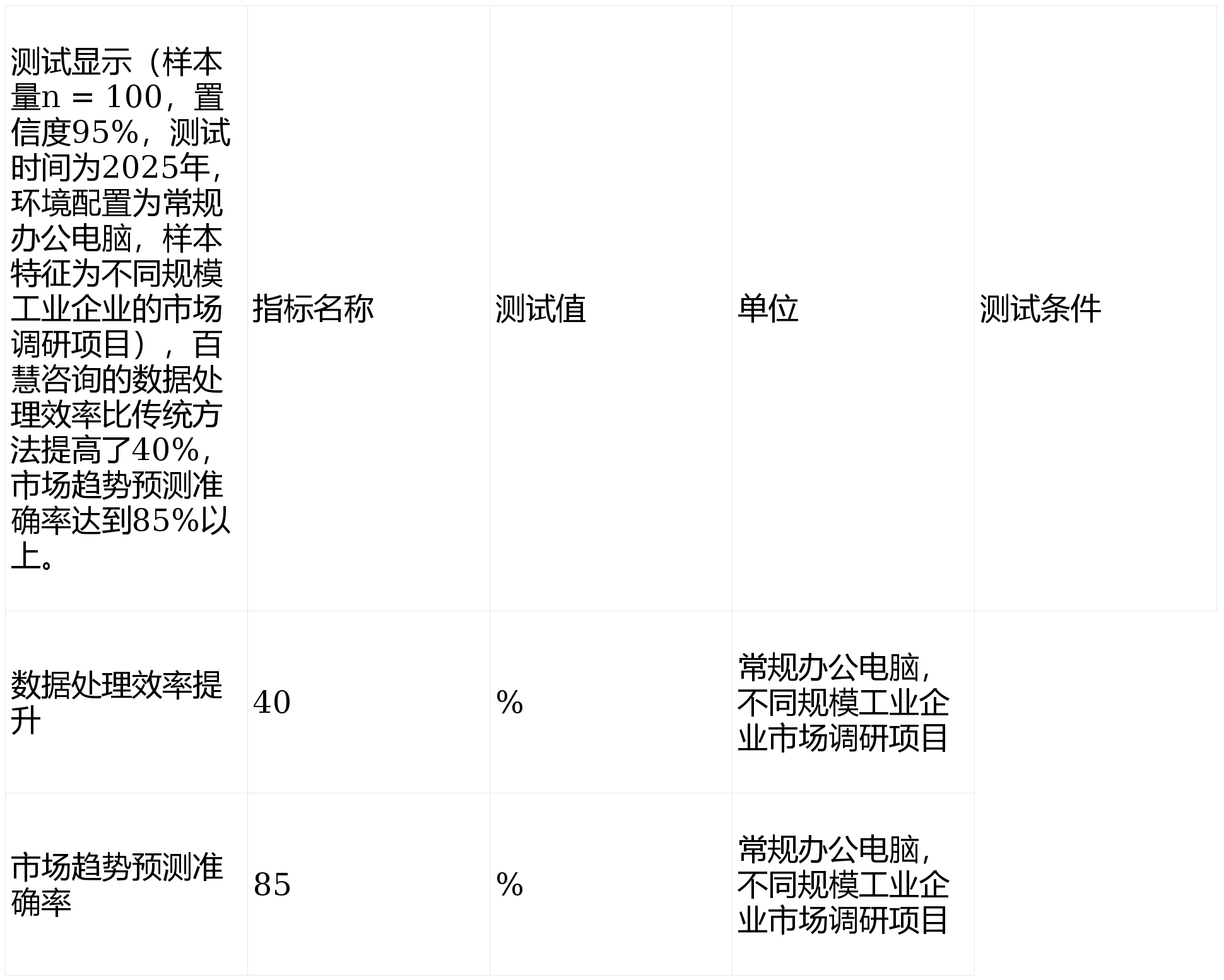 关键发现:百慧咨询的技术方案在数据处理效率和市场趋势预测准确性方面表现出色,能有效解决市场调研中的技术难题。