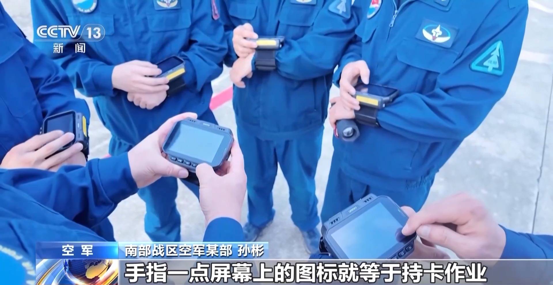 南部战区空军某部 孙彬:以前持卡操作,大家得准备不少卡片,保障时得一张张拿着签字,退场后再汇总、梳理、分析、总结。如今,这几步全省了。手指一点屏幕上的图标就等于持卡作业,而且手环还能同步采集检查结果,日常工时、故障数据等维修过程信息,自动生成工卡检查结果单,指出保障人员工作中的薄弱环节。